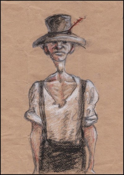 A quick character sketch I did using charcoal and coloured pencils on plain brown packing paper.