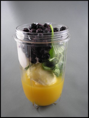 Just thought I'd share what fuels me - in this case, my first smoothie with spinach! This fabulous concoction looked so pretty before I blended it that I felt compelled to take a picture. Mango juice, Greek yogurt with honey, baby spinach, banana and frozen blueberries - delicious!! Really!