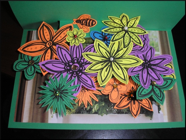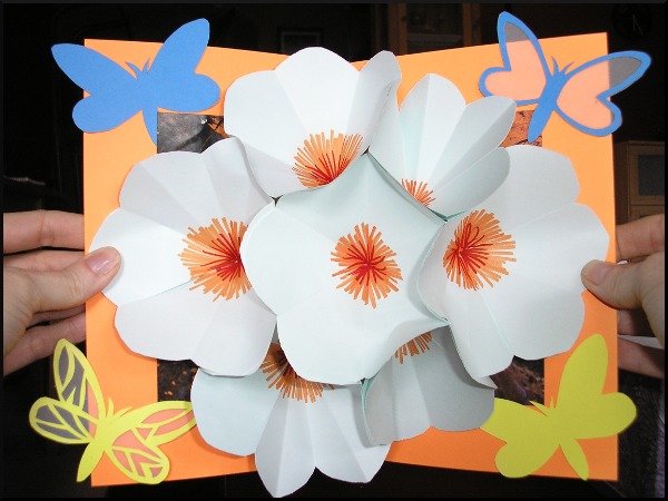 I often give hand-made cards for special occasions. For a group birthday party this month I got all ambitious and decided that I'd try pop-up cards. This came after a pretty successful try at an origami flower for my mom for Mother's Day, and I was feeling confident. Two days later (!) I had a pop-up card for one sister, an origami pop-up card for another sister, and a slider card for my nephew.
