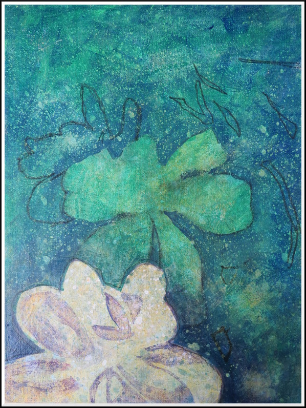 Here are several images showing the progress I've made so far with my negative painting. My underpainting consisted of a textured white and yellow wash of paint. I sketched in my first shape (at the bottom) and then painted the negative space around it. My second shape was sketched in above, and I painted around that. By the time I'd sketched in and painted around my third shape, there had been several washes of colour over most of the canvas. The next step was to paint a very dark wash of colour around the last shapes, emphasizing the more subtle forms that were still visible. At this point I began to think about my focal spot for this piece, and started to push certain shapes back in order to draw the eye to the centre of the canvas. More work on that next...