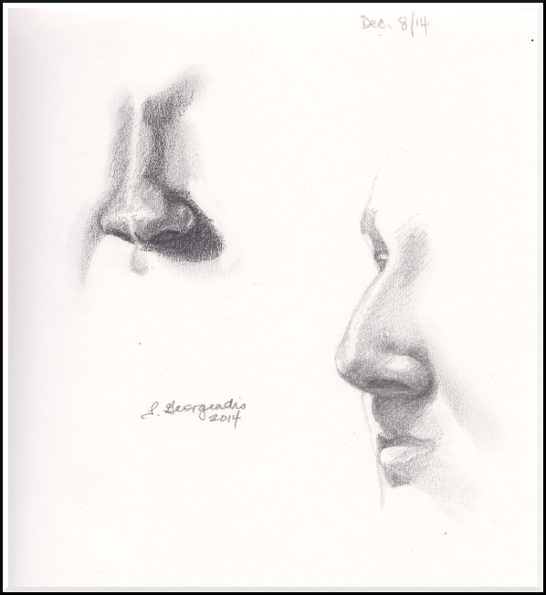 I find drawing noses to be fascinating and always challenging. This is one facial feature that I need tons of practice sketching, so here are a couple of shnozzes from today: