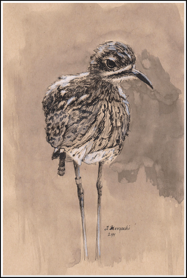 One of my all-time favourite animals to draw is this bird that I photographed a while ago. His big, staring, reproachful eyes and the stark markings around his beak give him an angry look no matter which way he faces!