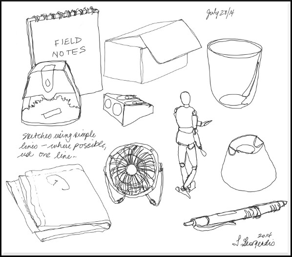I tried to sketch a few objects on my desk using as few lines as possible to capture the shape, and in some cases, I successfully used only one line. This was a challenge meant to force me to be as economical as possible with line, while also being as accurate as I could: