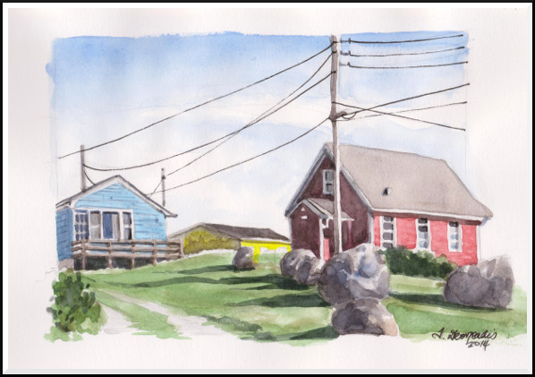 I started this painting of Peggy's Cove village on Friday, but I didn't get beyond the sketch. Today I finished the colour: