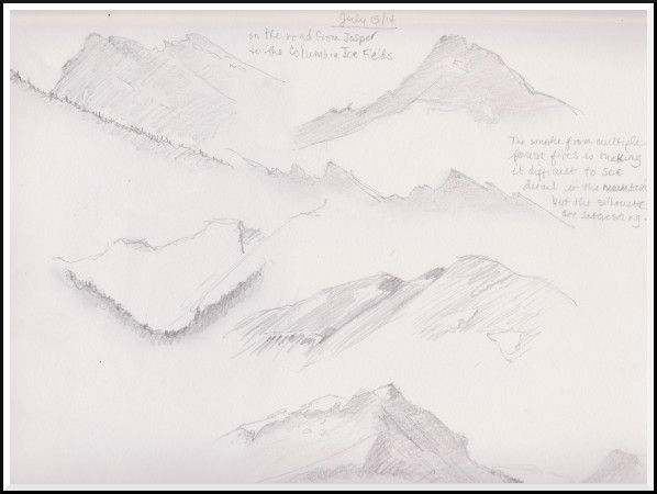 Because of numerous forest fires burning in the area, smoke sometimes obscured the gorgeous mountain ranges all around us. On our drive back yesterday, I tried to sketch the mountains, but smoke had turned them into hazy silhouettes, erasing the fascinating details. So, I sketched the silhouettes: