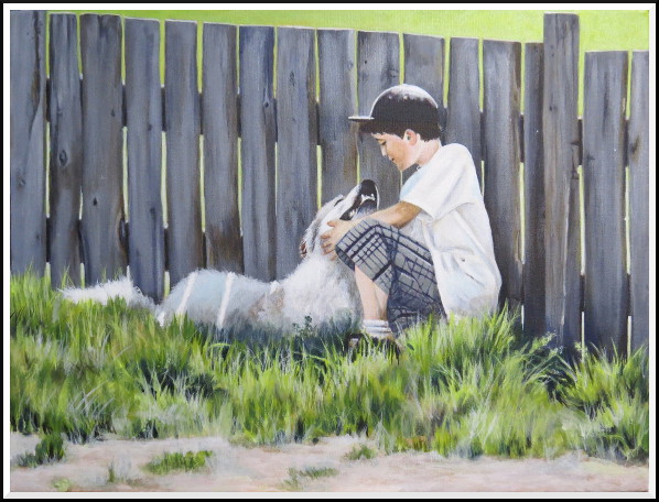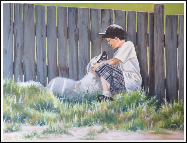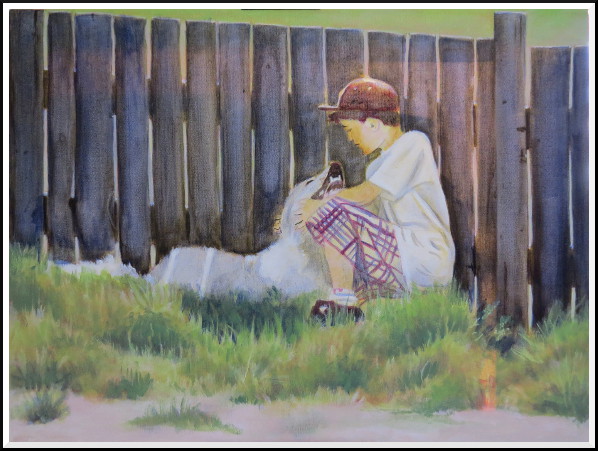 I added a lot more detail in the boy and the dog, and now I'm working on reclaiming the intensely lit patches of grass in the foreground. There's still more work to be done in terms of increasing the contrast between darks and lights, an essential element in getting the eye to read a scene as brightly sun-lit.