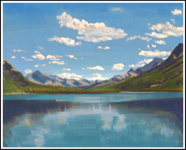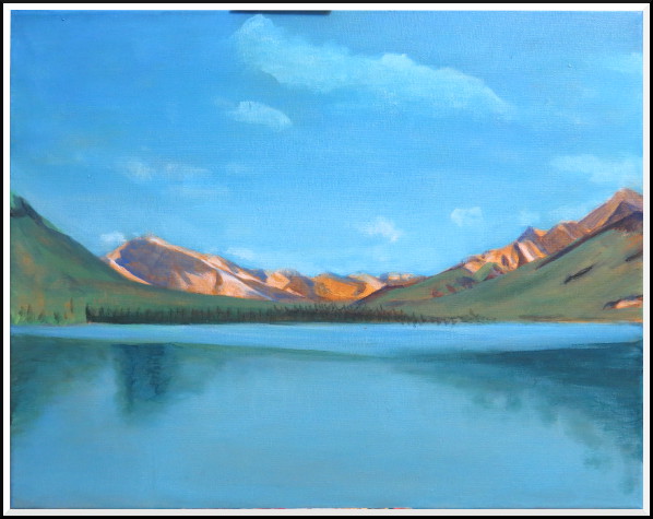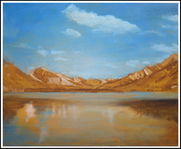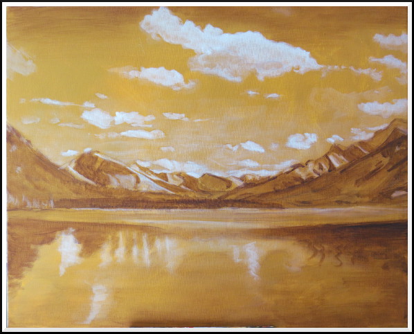 The first step in a commissioned painting of Goat Pond that I'm working on – planning the colour I'll use in the underpainting. I've chosen a mix of orange and burnt sienna to liven up the mostly cool greens and blues in my reference photo: