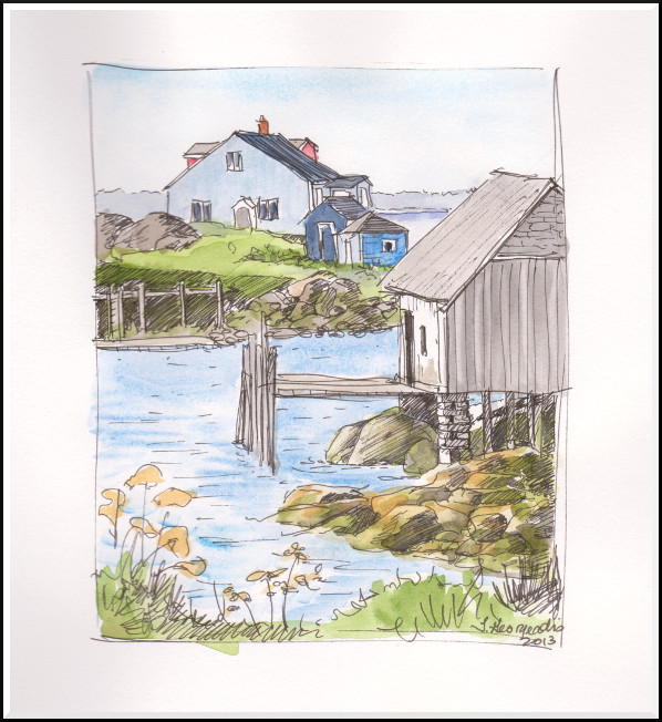 Our visit to Peggy's Cove was such a memorable experience. Everywhere we looked was a photo or drawing opportunity. Today I tried to capture this particular scene with efficient line and simple colour: