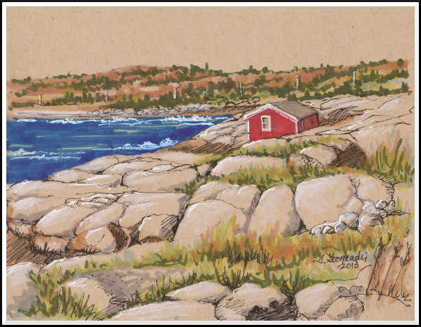 Inktober, day 30. A brilliant blue sea and 10,000 year-old boulders at Peggy's Cove: