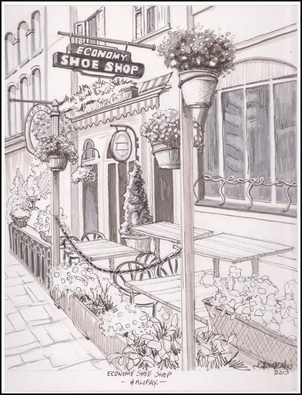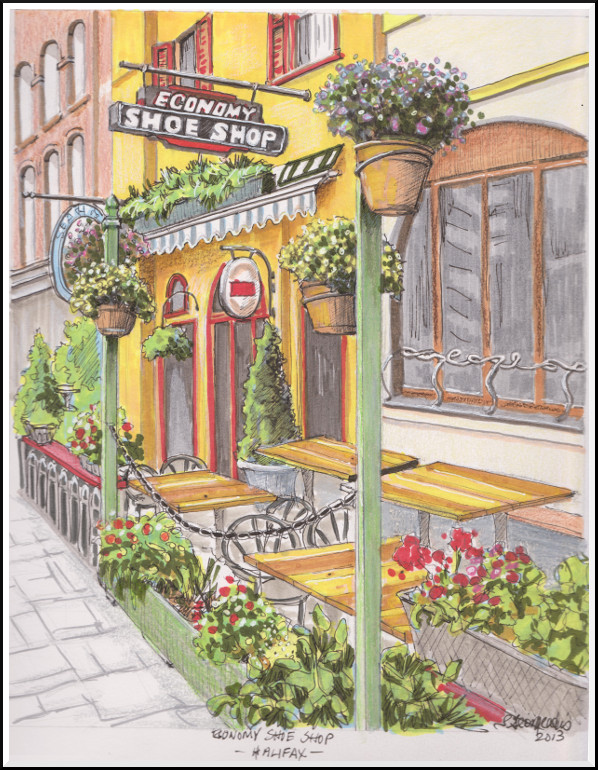 For Inktober, day 22 I drew the Economy Shoe Shop in Halifax. But I just can't resist adding colour to this attention-grabbing restaurant, so this will have to be part one of two...