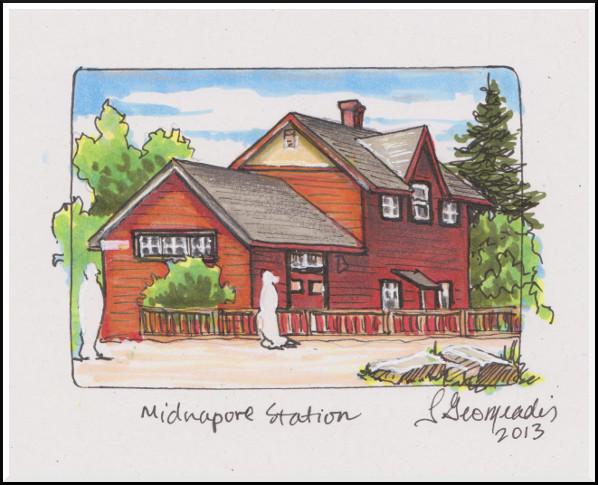 Midnapore Station. I thought I'd place a couple of simple figures in the scene, but in retrospect, they look like ghosts. Perhaps that's appropriate, since there are so many ghost stories associated with Heritage Park!