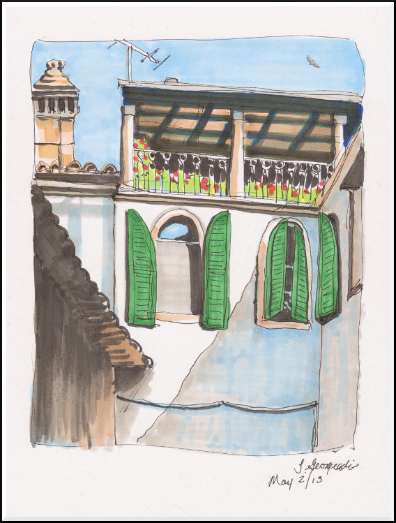 Ah, reminiscing about our trip to Italy last year. This was a house in Sorano with beautiful green shutters, begging to be sketched: