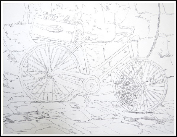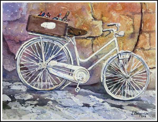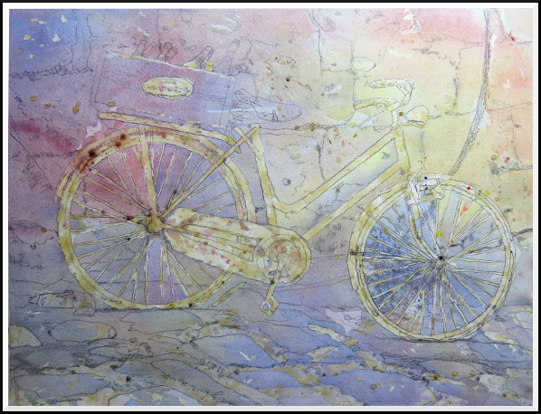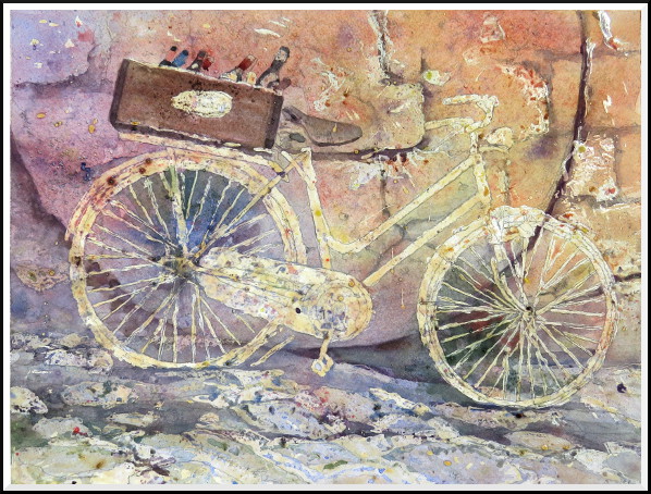 I took the masking off the painting, then worked for a while on painting in cool washes of colour for the shadows on the white-washed bike. I was considering using some additional washes of colour in the rocks in the foreground, but I decided that the texture created by the masking fluid was much more interesting. Here is the finished painting: