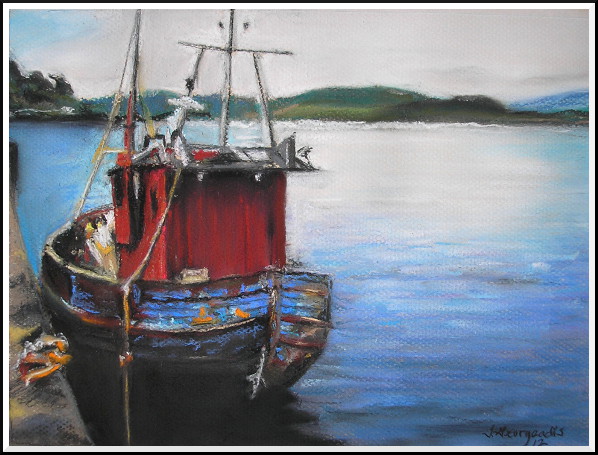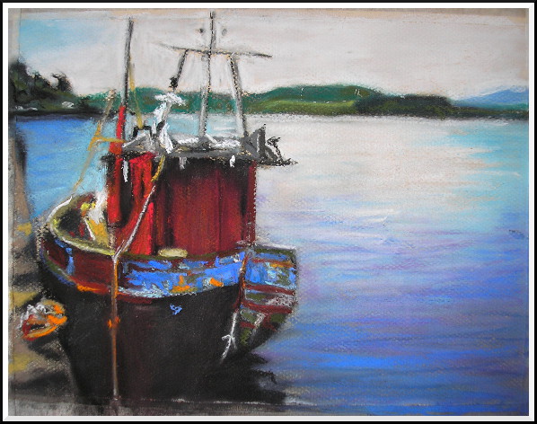 Next was the rather lengthy process of filling in colour and detail in the fishing boat, trying to keep my marks light and suggestive of form rather than belabouring the process by trying to make the image photo-realistic: