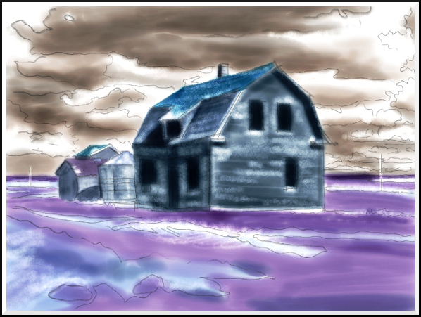 I've had second thoughts about how to do the underpainting for my pastel of the barn. After doing a bit of research into how other pastel artists work, I've decided to do a watercolour underpainting using complementary colours, instead of one flat wash of colour. Since I'm such a consummate planner (I believe the slang term is “chicken”), I did a digital thumbnail first to see what that would look like: