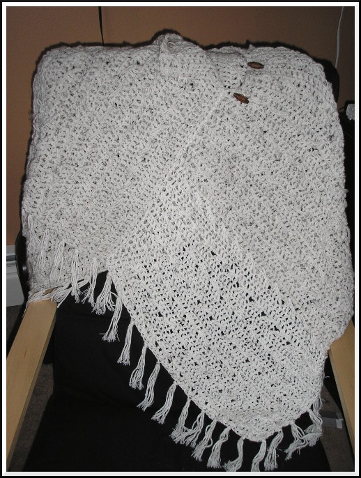 I had a busy day yesterday, rushing to finish a crocheted poncho – a gift for my sister's birthday. I wanted to post a photo, but as the poncho was a surprise, I couldn't until today. Crocheting has become one of my hobbies, one which I do when I want to occupy my hands, but my brain is done for the day. This is a similar poncho that I made for myself: