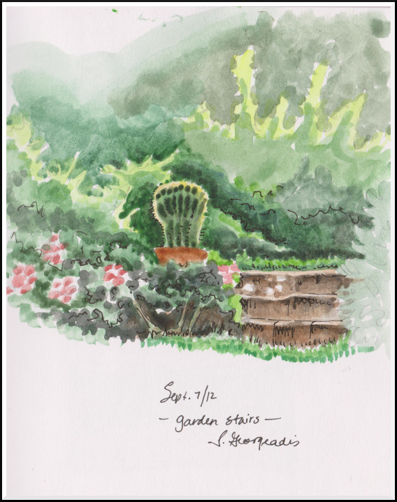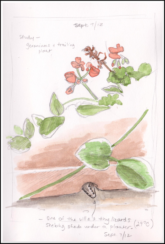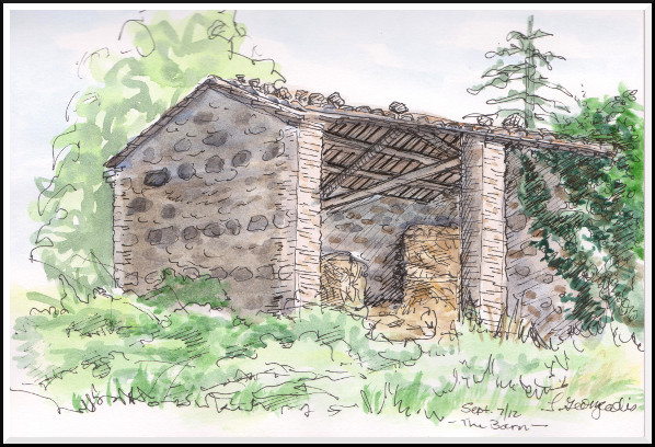 Ah, just looking at this painting gives me a visceral reminder of just how hot it was up by the Villa's old barn. Although this location was a mere thirty feet away from the house itself, it was situated up higher on the hill and in full sun, with sparse, dry plant growth and gravel underfoot. In fact, the lush, green vegetation depicted here was a result of the plants having the advantage of growing in partial shade. The bugs – flies, wasps and ants were out in full force, somehow thriving in the 30°+ heat, dive-bombing me, landing on me, and in general, annoying the heck out of me! The barn itself was a pleasure to paint, however, with its old beams and sturdy stone structure. While doing the initial sketch, I noticed that there were heavy stones placed along the edge of the roof, perhaps to keep the clay shingles from lifting in the wind?