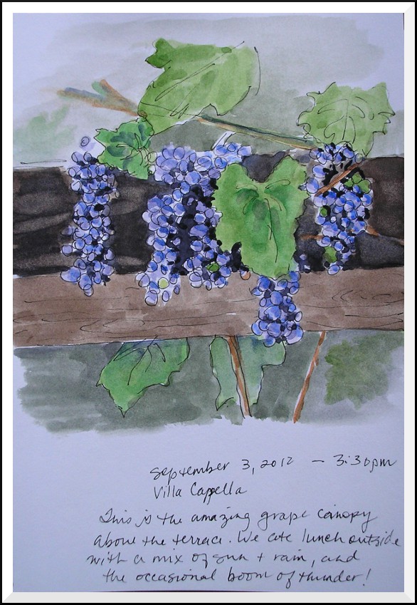 The best part about sketching on location at Villa Cappella was the sounds all around me – not the noise of the city or vehicles, but the chirping of crickets and birds, the skitter of lizards, and occasionally a brief warning bark from Luna the Villa Dog. I could have sketched there for weeks and never gotten tired of the sounds of the country.