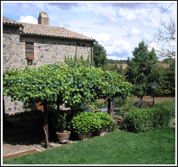 The grapevine canopy over our terrace at La Cappella was a cool respite from the sometime brutally hot sun, and once or twice shelter from the rain: