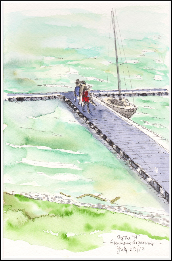 My hubs offered to go with me to the reservoir to sketch today, which he might have regretted afterwards! We were out for over an hour in the most violent wind I've ever sketched in – at times it was gusting up to 60km/h – making drawing and painting a challenge, to say the least! I was trying to lay down water, then pigment to achieve a relatively fluid wash of colour, and in the few seconds it took me to put paint on my water brush, the water had already completely dried on the paper! Filling my water brush from a small bottle of water blew the water right in my face, and I was constantly afraid of losing my brush or pen to the next gust of wind.