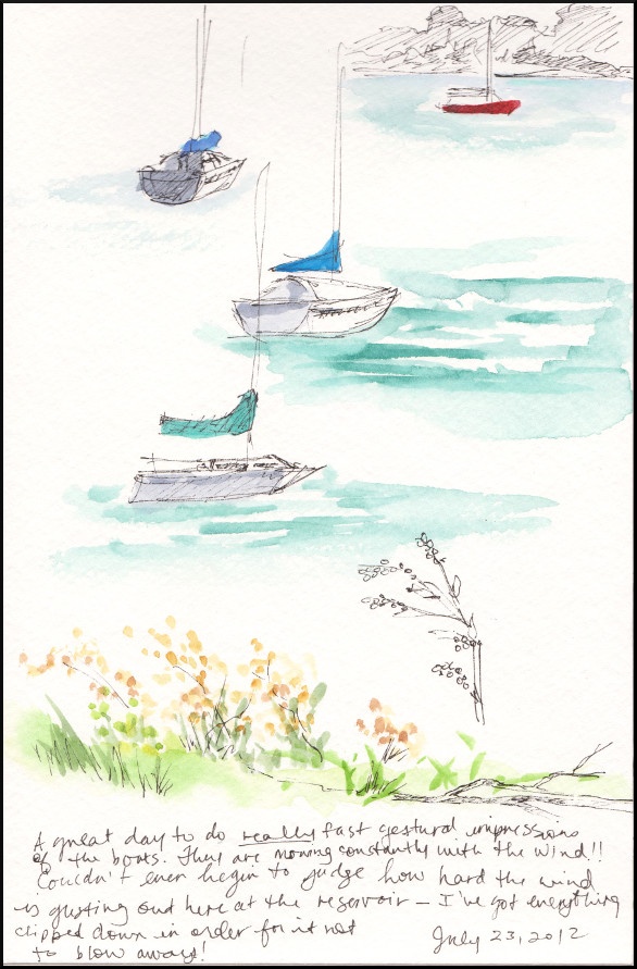 The VERY fast drawings I did of several boats docked at the reservoir yesterday. These boats were turning so fast in their moorings that capturing even one angle was a big challenge!