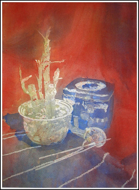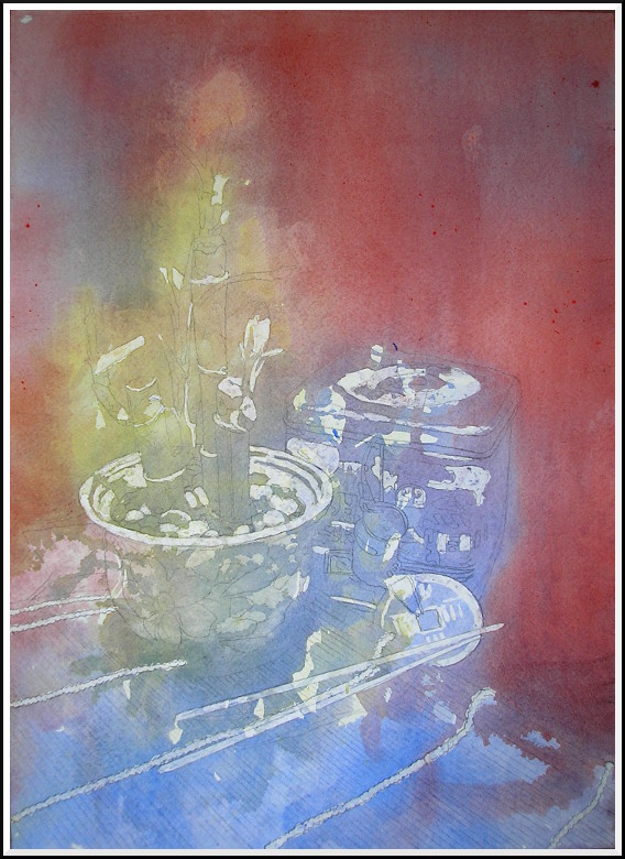 Ah, at last I got back to my current watercolour. Here is the painting after the first masking and watercolour pour: