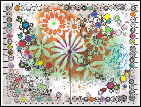 My latest art journal page, rife with stamped images and just enough empty space to actually write something!