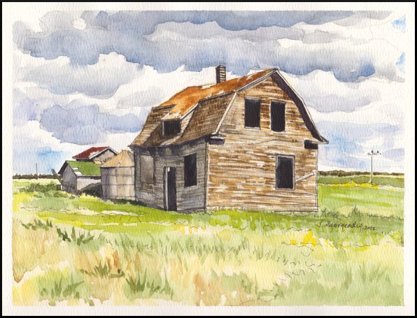 We took a very fast road trip from Calgary to Ponteix, Saskatchewan, leaving Monday afternoon and returning late last night. I took the opportunity to do some sketching and painting along the way. On the trip home from Ponteix was an old barn with so much character that I had to stop and take a picture to paint from later! This was the barn just after a torrential downpour when the clouds were clearing and the sun broke through.