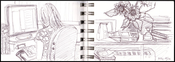 Busy day today, but I had a chance to sketch while waiting for my sister at her office. Here she is answering a million emails before she can go home!