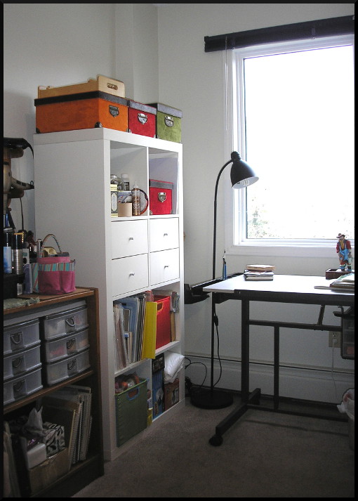 One of the things I'm constantly battling with is how to organize my tools and supplies so that everything I need is close at hand and easy to clean up after I use it. I've reorganized my studio so many times, each time clearing out heaps of things that I've been keeping for unknown reasons. I'm one of those people who finds it infinitely easier to work when the space around me is clutter-free, so every time I reorganize I find it helps the flow of my creative thoughts. I found an excellent storage unit (at IKEA if anyone's interested) that helps me stow away a lot of my supplies neatly, keeping everything at hand and allowing me to retire my old pre-fab, rickety storage shelf. Here is a glimpse of the neatness!