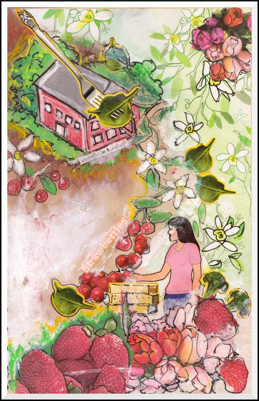 I wanted to do a more traditional collage this time rather than one done digitally. This one is a combination of magazine images (including stickers of spinach leaves and cheese I found in a magazine!), black marker, chalk pastel and tissue paper: