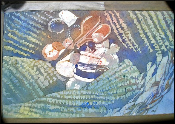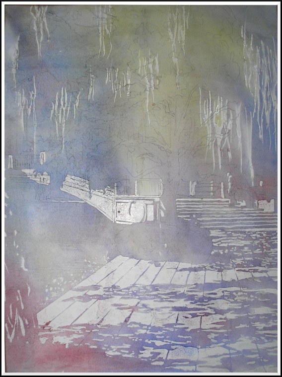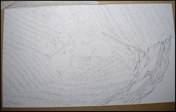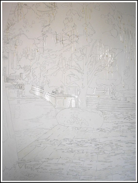 After I did a detailed sketch on an 11” x 19” sheet of 150lb watercolour paper, I masked out areas that I wanted to stay white and near-white in the final piece. This is what the initial sketch looked like: