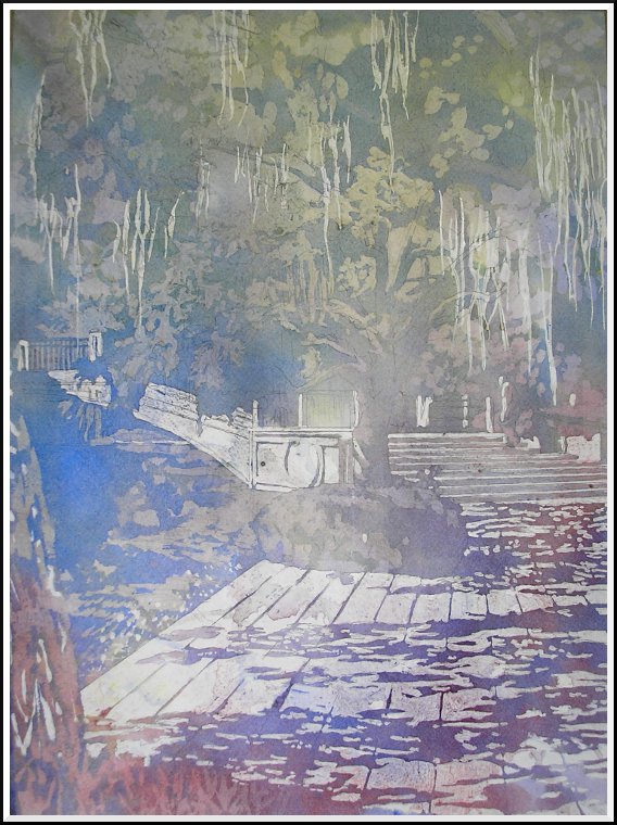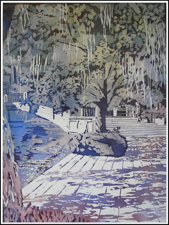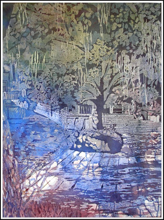 The next step was to mask out more shapes and values – this time all the dappled shadows in the mid and foreground, and lots of mid-values in the tree and water. Overall, I'm pleased with the variety of colour temperatures in the piece. There is one more pour left to do, and I want to make that one quite intensely pigmented.