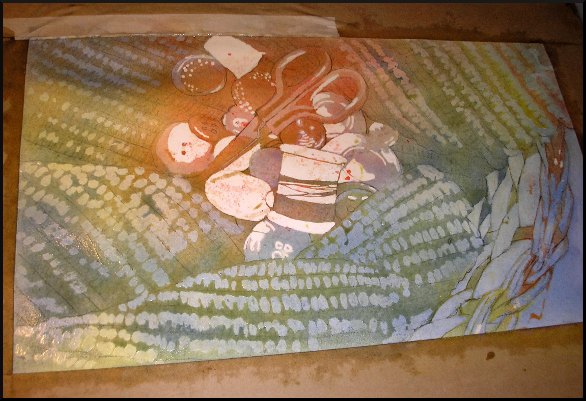 Phew! I'm feeling better about the details in the tree after the second pour! It's difficult and strange to paint out details in a clear masking fluid, not really knowing what shapes I'll end up with. I need to imagine that the shapes are there, and trust that I'll see them after the next pour of colour.