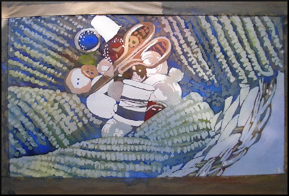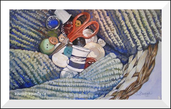 The third watercolour pour was a bit more focused and used slightly more concentrated pigment. This time I was concentrating on really darkening the shadows behind the sewing objects and in the folds and bumps of the woven mat. Next, I used a fat, soaked brush to deposit drops of intense colour in the scissors and several of the buttons, and to splash some unexpected colour in the green mat. I did a bit more masking of the middle values so that the next pour would deepen and intensify the shadows: