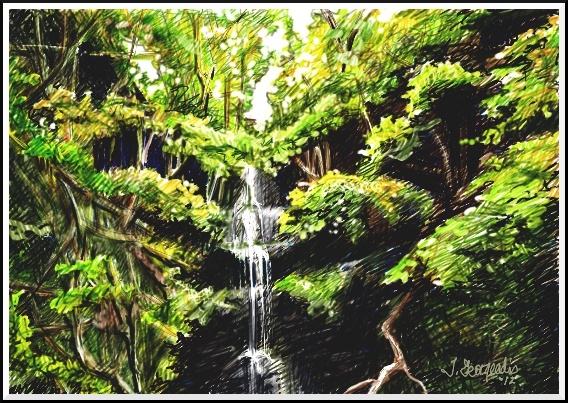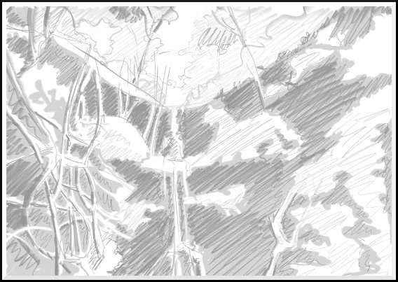 I was interested in experimenting with using digital coloured pencils in a landscape drawing. For this drawing I began with a quick tonal sketch in 4B pencil, then laid in coloured pencil over the sketch: