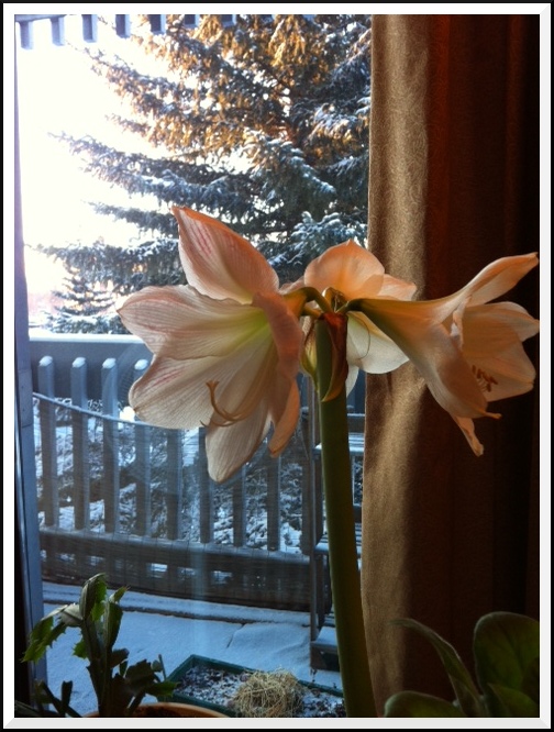 Outside it's a winter wonderland, but inside I have plants and a vigorously flowering amaryllis to bring some brightness indoors!