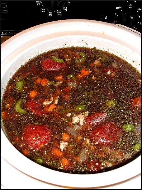 This soup had cooked, lean ground chicken and sauteed onions as a base, then carrots, celery, tomatoes, consommé, spices and quinoa were added in and the whole thing simmered for several hours in a slow cooker. We baked some half-baked whole wheat buns to go with it – yum!