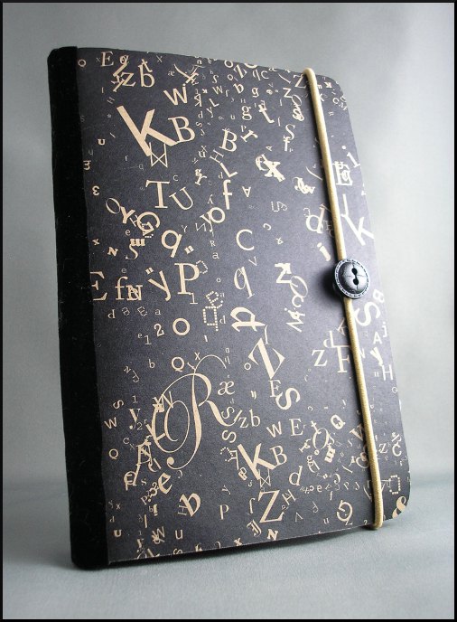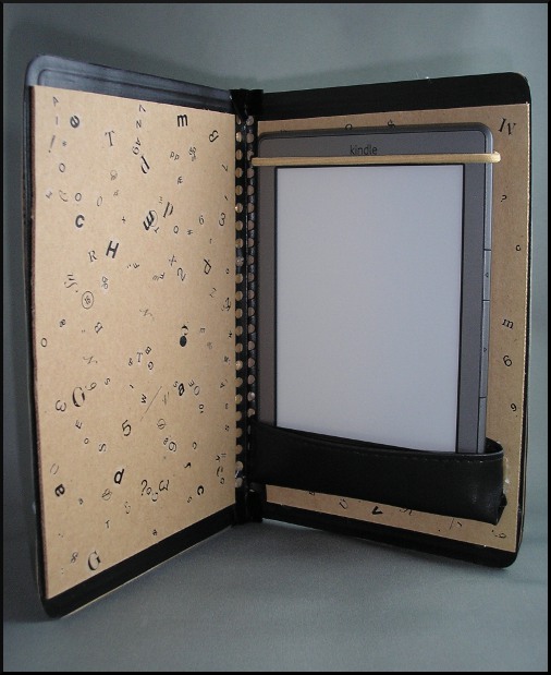 I found myself enamoured with the printing inside the Kindle packaging (I know, weird), so I cut it out and used it to cover an old day planner. I reinforced the front and back covers with cardboard and spruced them up a bit with some typography transfers. Finally, I cut a leather pocket from an old bound calendar to make a pocket for the device, and glued a hair band across the top for support. The same hair band made the elastic front closure (topped with a button for decoration).