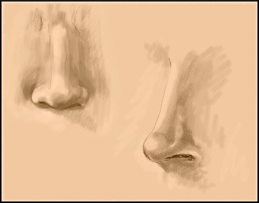 One of my weaker skills in life drawing is rendering realistic noses, so I've decided to practice, practice, practice until I get it right and it starts to come more naturally to me. This is the first set of nose sketches. I began with a light under-sketch of the anatomy of the nose, including all the planes of bone and cartilage, then I drew a tonal sketch over top, using the underlying anatomy to define shape and density.