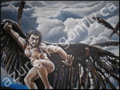 Well, it's coming down to the final finishing details on Icarus – yes, he's almost completely finished! Today I worked on the density of colour in some areas of the painting, mainly in the clouds and the land mass to the lower left of the piece. The sky needed a few tweaks in value, and Icarus got a wash of warm colour all over to make him a bit less corpse-y – he's been a little too grey and white up until today!