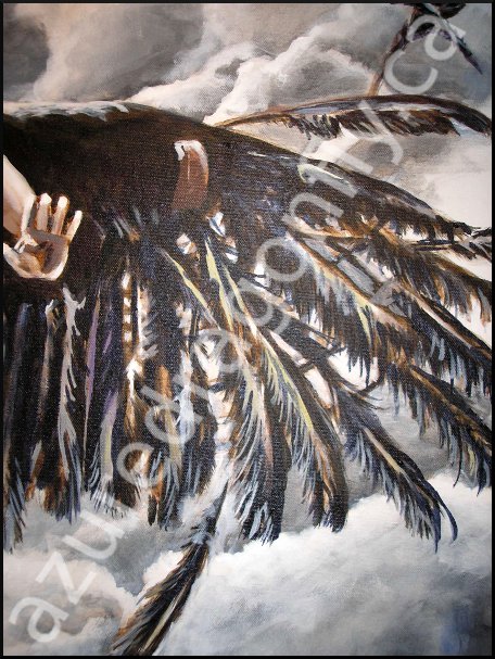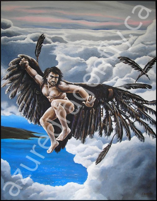 My focus today was to lighten the values in the clouds and to try to fix the light source on Icarus. I also worked on defining the feathers a bit more on the right side of the piece, as well as adding warmth over the cool values I painted into the feathers yesterday. The nit-picky details always take the longest – much longer than laying in large areas of colour!