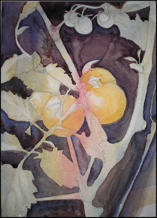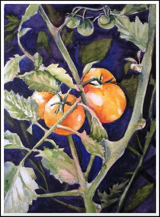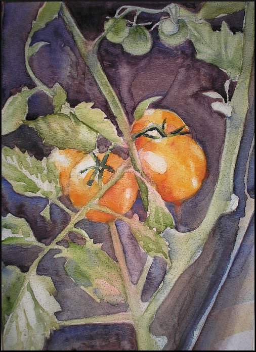 My subject was the cherry tomatoes from my garden. I've included a shot of my painting after the sketch, first wash and initial glazing of colour was done: