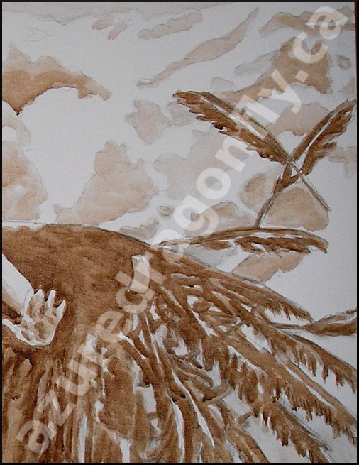 Here is a portion of the Icarus underpainting, about 70% completed. You can see how I'm underpainting in a very loose, fluid way, mainly working in basic shapes and roughing in values. Once this stage of the underpainting is dry I'll do another, slightly darker wash of Burnt Umber and Mars Black to establish the very dark areas. My final step will be to focus on bringing out details in the figure and his wings - the most important focal areas in the piece. I'll post the completed underpainting tomorrow, and then it's on to colour!