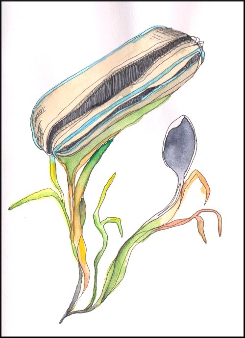 Today is a rather fractured day work-wise. I'll be flitting from one thing to another, so instead of another photo of my progress with Icarus, I'm offering a piece from my sketchbook. This was a cheeky little drawing I did a while ago as an excuse to play with my watercolour pencils, and for something to do while I listened to CBC Radio podcasts. I wasn't really thinking so much about the imagery - I drew my pencil case and a spoon, and before I knew it, they were sprouting up from a corn stalk (?).