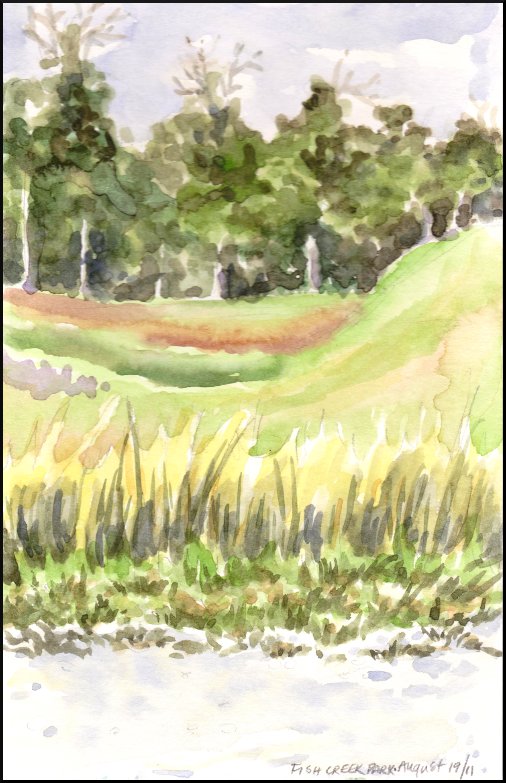 We spent an afternoon in Fish Creek Park on Friday, enjoying the sun and taking pictures. I sat by the roadside and tried to capture a sunlit meadow as quickly and loosely as possible. Although this was definitely a quicker painting than my other plein air work, it still took over an hour. My ongoing challenge is to paint in a much more fluid, free way, but I still have a long way to go!