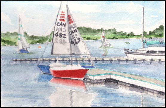 The best thing about plein air painting is going somewhere new to work on location. Yesterday it was the Glenmore reservoir - a familiar place, but one I've never painted before. I sat on the big rocks just up the hill from the boat club and painted boats coming into and leaving the docks. The biggest challenge was getting down my initial sketch quickly, before the subject matter sailed away!