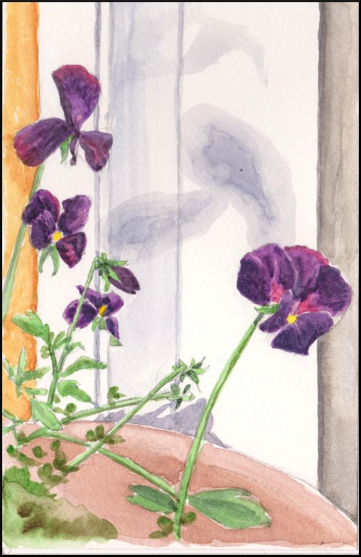 I've discovered just how challenging it is to paint a violet pansy in watercolour. The subtle way that sunlight illuminates the petals, the near-black of the petals in shadow, and the velvety texture of the flower are all so very difficult to capture. Certainly not impossible, but man, I had a hard time of it this afternoon! This is by no means the best work I've done, but here it is anyway. Onward!